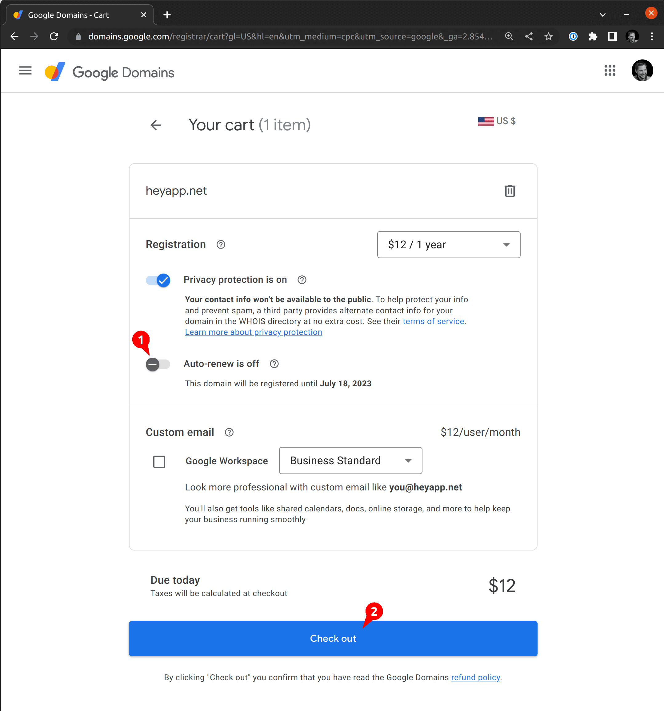 hello-app.comは2,800ドルと高価なので選択せず、最上位のheyapp.netを選択します。良さそうですね!次に、カートボタンをクリックします。次の画面で、自動更新を無効にします。毎年このドメインの料金を支払いたくないからです。